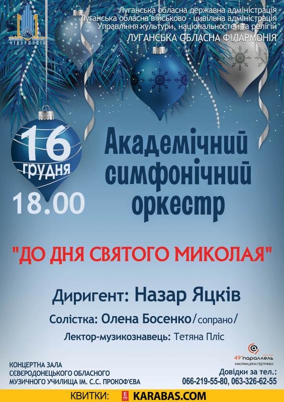 16 грудня, до Дня Святого Миколая, Луганська обласна філармонія підготувала для улюбленого слухача святкову програму Академічного симфонічного оркестру, насичену чарівною класичною музикою.