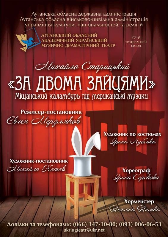 Луганський обласний академічний український музично-драматичний театр представляє виставу за пьєсою М. Старицького «ЗА ДВОМА ЗАЙЦЯМИ». Міщанський каламбуръ під мериканські музики.