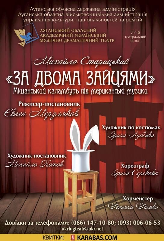 Театр пропонує свіже бачення знайомої історії про те, що кожен на цім світі мріє відшукати своє щастя. Завдяки режисеру-постановнику Євгену Мерзлякову вона перетворюється у сміливу фантазію на тему п'єси М.Старицького "За двома зайцями". А сучасна музика, насичені пластикою акторські роботи, яскраві номери балету наполегливо пропонують глядачам не згадувати про перегляд однойменної кінострічки, а поринути у захопливу театральну гру.