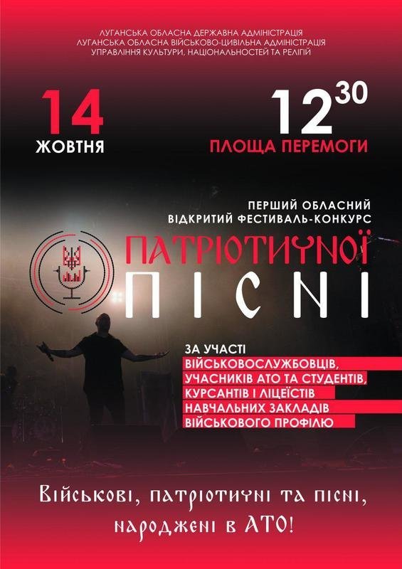 14 листопада 2018 року о 12.30 на площі Перемоги м. Сєвєродонецька у межах святкування Дня захисника України і Дня Українського козацтва відбудеться перший обласний відкритий фестиваль-конкурс патріотичної пісні!