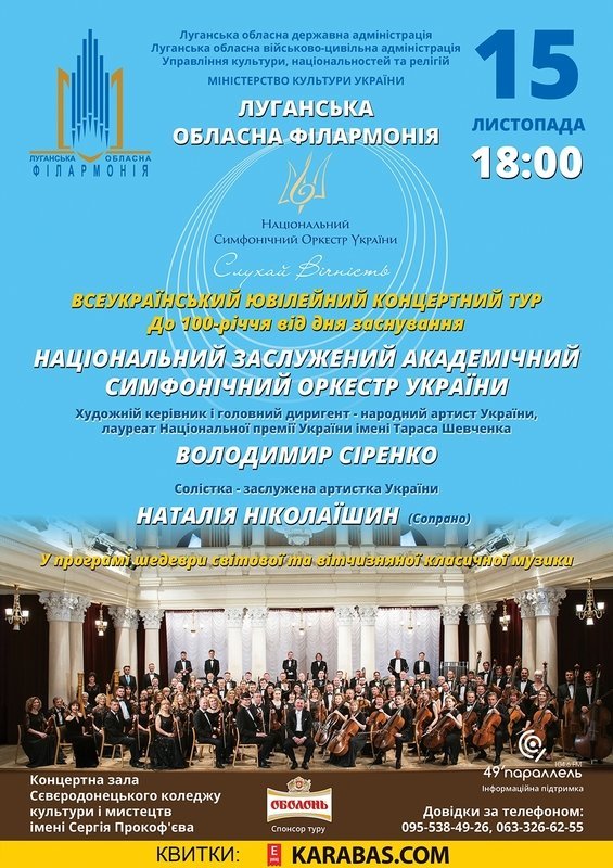 15 листопада 2018 року о 18.00 у Концертній залі Сєвєродонецького коледжу культури і мистецтв імені С.С. Прокоф’єва відбудеться концерт Національного заслуженого академічного симфонічного оркестру України в рамках Всеукраїнського ювілейного концертного туру до 100-річчя від дня заснування.