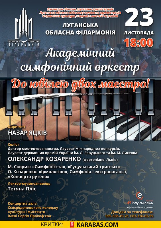 У цей музичний вечір ви матимете змогу почути неповторну гру на фортепіано соліста-інструменталіста, Доктора мистецтвознавства, Лауреата міжнародних конкурсів, Лауреата державних премій України ім. Л. Ревуцького та ім. М. Лисенка, відомого українського композитора, учня М. Скорика, Олександра Козаренка /Львів/. Артисти Академічного симфонічного оркестру виконають кілька його творів, зокрема «Ірмологіон», «Симфонія Естраваганца» та «Кончерто Рутено».