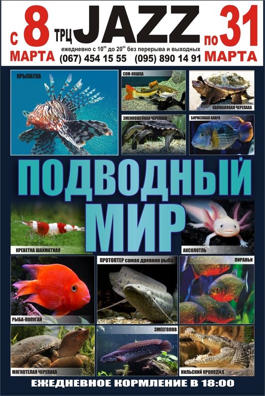 Подводный мир. Рыбы(более 30 видов, Протоптерус - самая древняя Рыба, Полиптерусы-древнейшие Рыбы, пираньи плотоядные, пираньи травоядные, рыба-нож, панцирная щука, сом-Кошка, змееголов), крокодилы(2 вида), Черепахи4 вида), анфибии. 25 аквариумов по 500 литров. 40 взрослый, 30 детский, до 3-х лет Бесплатно. Фотосъёмка разрешена. Ежедневно с 10.00 до 20.00, без обеда и выходных.