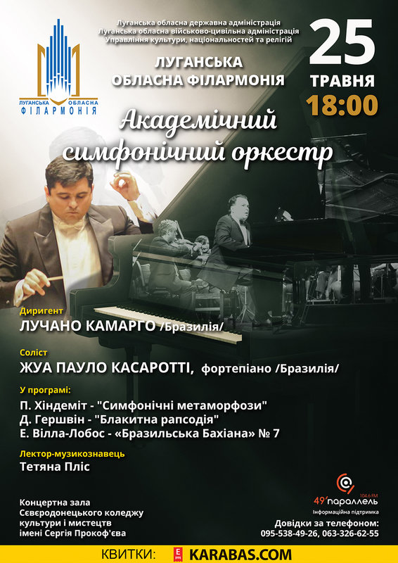 25 травня 2019 року Луганська обласна філармонія запрошує на концерт Академічного симфонічного оркестру, який подарує всім слухачам незабутній вечір симфонічної музики під керівництвом запрошеного диригента з Бразилії.Лучано Камарго – музикант і диригент із значним професійним досвідом. Працює художнім керівником і титулярним диригентом Академічного оркестру Сан-Паулу, має досвід роботи художнім керівником хору міста Сан-Паулу, директором Священної музики кафедрального собору, директором духовної музики Св. Петра і Павла Кирхе у Фрайбурзі (Німеччина). Він також магістр музики Школи зв’язку і мистецтв, бакалавр оркестрового диригування ECA - USP у класі Aylton Escobar; закінчив курс скрипки в Муниципальній музичній школі у класі Сесілія Гіда. Лучано приймав участь у Міжнародному семінарі-практикумі з видатними викладачами, брав участь у II Міжнародному конкурсі регентства - Премія OSESP 2006, у 37 зимовому фестивалі Campos do Jordão у класі Роберто Мінчук та інше.Цього чудового вечора під керівництвом маестро у виконанні оркестру прозвучить загадкова та яскрава творчість найвідоміших композиторів, що вже завоювали увагу слухачів своїм неповторним колоритом, запальними ритмами та волелюбною музикою. Легендарний твір «Симфонічні метаморфози» з життя яскравого представника неокласицизму в музичному мистецтві Німеччини – композитора Пауля Хіндеміта прозвучить у виконанні оркестру. Також у програмі концерту звучатиме творчість відомого латиноамериканського композитора Ейтора Вілла-Лобоса, яка здивує всіх присутніх неповторним звуками задушевної, пристрасної та водночас щирої музики. Ви почуєте твір «Бахіана» №7, що відмічений яскравим бразильським колоритом та використанням у ньому засобів сучасної композиторської техніки. В оркестровій «Бахіані» №7, що складається з Прелюдії, Жигі, Токати і Фуги найцікавіша Токата, що має підзаголовок «Музичне змагання», основна її тема виникає в оточенні терпких дисонансів. Ви почуєте твір «Блакитна Рапсодія» з творчості фундатора американської музики відомого композитора Джорджа Гершвіна, який подарує яскраві ритми.Приємним сюрпризом для слухачів стане участь у концертній програмі гостя з Америки – соліста Жуа Пауло Касаротті, фортепіано.Отже, пропонуємо екзотичну подорож яскравими ритмами чарівної Бразилії, Німеччини та Америки. Чекаємо на вас 25 травня 2019 року о 18.00, у Концертній залі «Сєвєродонецького коледжу культури і мистецтв імені Сергія Прокоф’єва», щоб всі разом завітати у країни незвіданої краси.У програмі:П. Хіндеміт - "Симфонічні метаморфози"Д. Гершвін - "Блакитна рапсодія"Е. Вілла-Лобос - «Бахіана» № 7Лектор-музикознавець: Тетяна Пліс