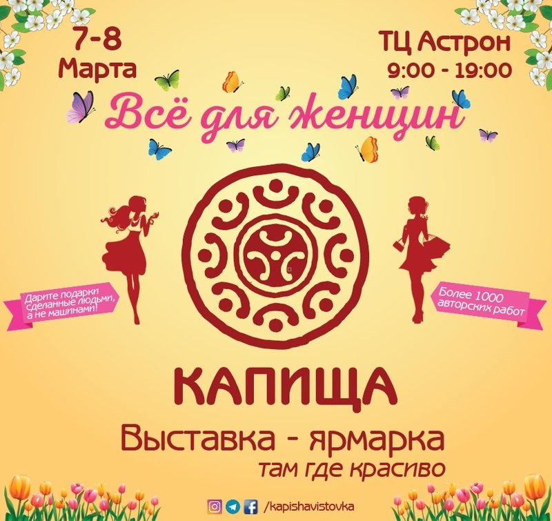 7 и 8 марта, ТЦ Астрон, 2 этаж, всех любителей прекрасного Капища приглашает на выставку-ярмарку "Всё для женщин"! Более 1000 работ от авторов и мастеров для Ваших любимых женщин! - солевые светильники - гончарная посуда - букеты и сладости - мягкие игрушки и украшения! - кожаные изделия и многое другое! Все вопросы по тел. 050-777-12-15 Мы в соц. сетях: фейсбук fb.me/kapishavistovka инста /kapishavistovka телеграм t.me/kapishavistovka