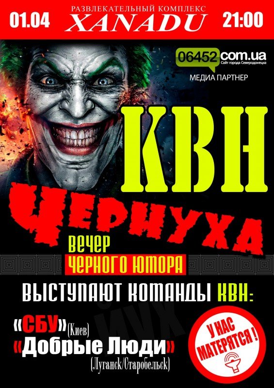 1 апреля, 21:00, в развлекательном комплексе "Xanadu" вас ждет вечер черного юмора - КВН Чернуха! Выступают команды КВН "СБУ" (Киев), "Добрые люди" (Луганск/Старобельск).