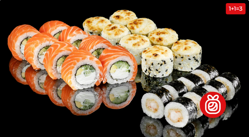Справжня комбінація улюблених ролів: «Інь Ян» з лососем і тунцем, футомаки з креветкою, каліфорнія з крабовим міксом у кунжуті та каліфорнія «Торі».